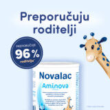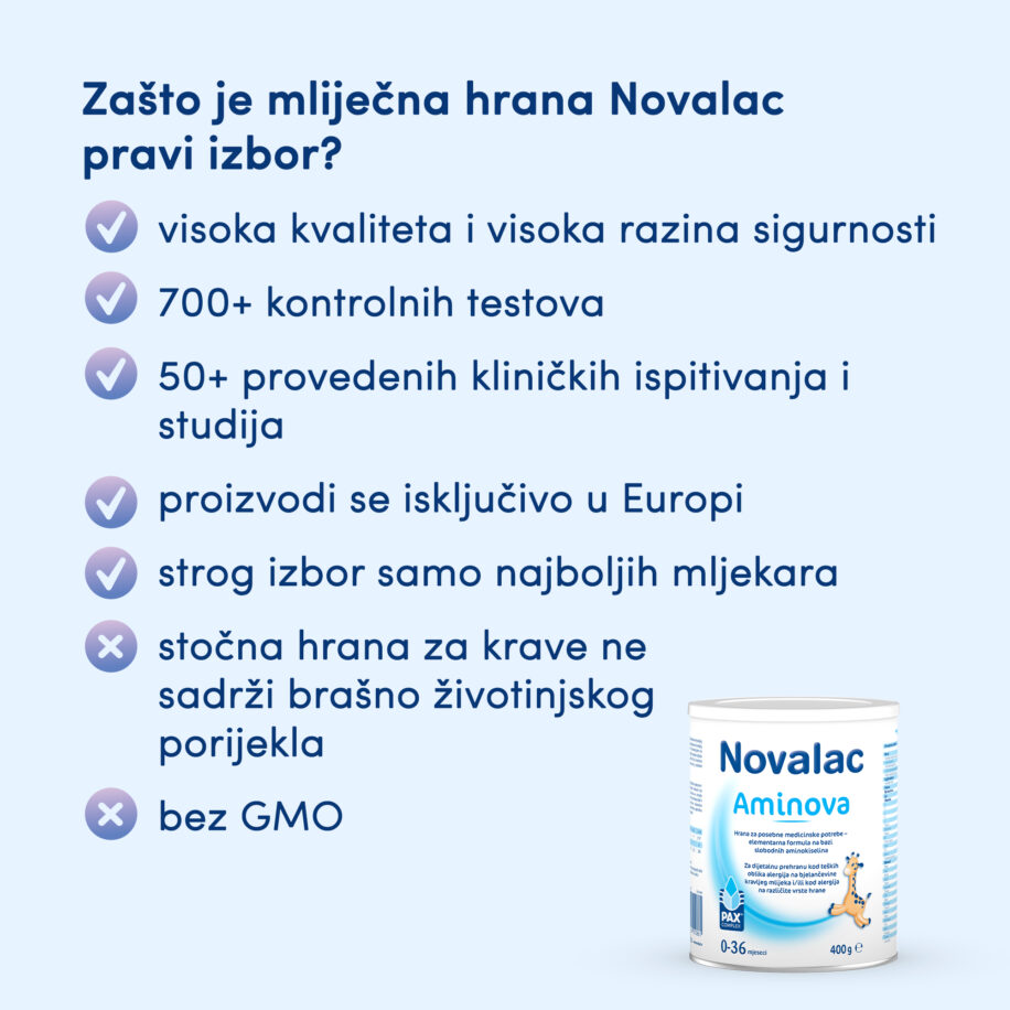 Novalac Aminova je hrana za posebne medicinske potrebe za dijetalnu prehranu dojenčadi i male djece s izraženom alergijom na bjelančevine kravljeg mlijeka i/ili u slučaju alergije na različite vrste dječje hrane, sa ili bez regurgitacije. Sadrži slobodne aminokiseline koje ne izazivaju alergijske simptome, a dodan je inovativni zgušnjivač PAX® complex koji smanjuje učestalost i količinu bljuckanja te pomaže normalizaciji stolice (proljev ili zatvor).